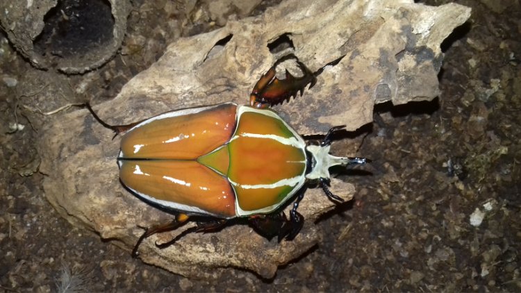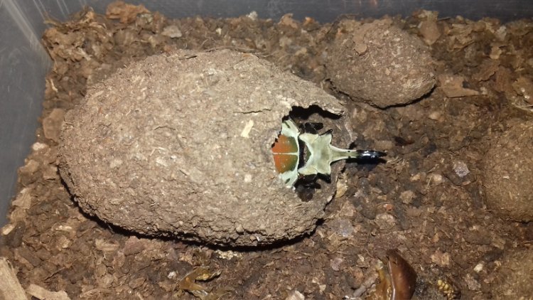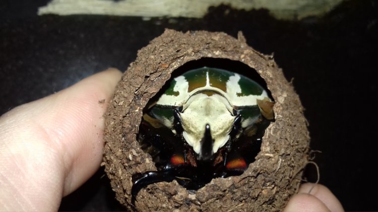 Vandaag kwam na lang wachten de kever zonder hulp zijn cocon uit. Meten is nagenoeg onmogelijk, het beest is te druk en te sterk. Een globale meting komt uit op 77mm. Een mooi pr, maar wel vrij ruim onder de gehoopte 8cm. Ach, ik klaag niet, er moet wat te wensen over blijven. Over de kleur ben ik erg tevreden!!!! Past goed bij de dame die op hem zat te wachten. Nu op naar een goede nakweek, maar die is wel gegarandeerd.
