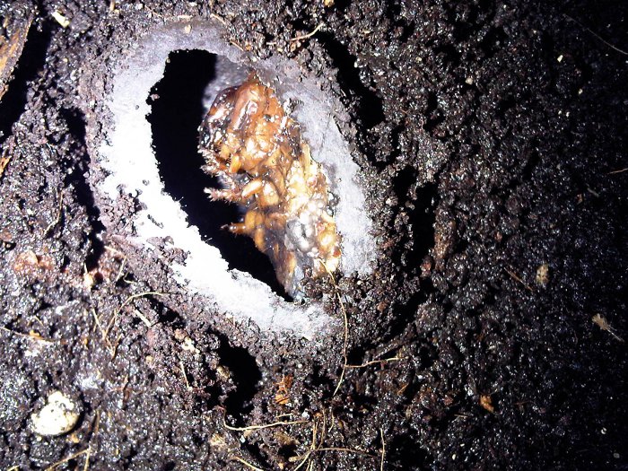 Kan het op de telefoon niet zo goed zien maar hij is niet goed van larf naar pop gegaan. Zijn larvale huid is niet volledig afgegaan en waarschijnlijk is de pop wat misvormd vooral aan de poten. Dat wil niet zeggen dat hij niet uit kan komen hoewel hij daar grote moeite mee zal krijgen. Tijdens het uitkomen beweegt de kever in de pop al zijn poten tegelijk van voor naar achter om zo uit zijn pop te breken. Als zijn poten mismaakt zijn en afwijken kan dit een probleem zijn. Mocht hij toch uitkomen dan is zijn overlevings kans klein omdat hij dan niet of moeilijk loopt. Zou de cocon open maken en kijken of de larvale huid kop is van de pop. Niet aan trekken ! dan kun je hem kapot trekken of open scheuren ! Voorzichtig kijken of je het velletje kunt oplichten. Zal vanavond thuis eens op een groter en beter scherm kijken.