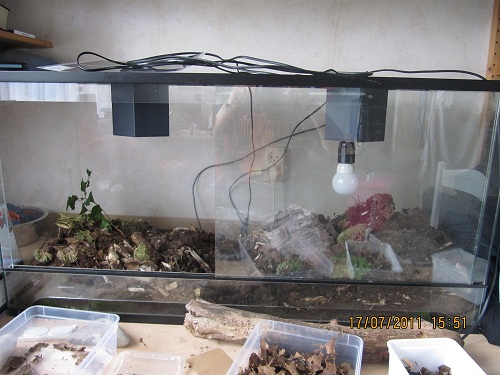 Ze kunnen met z'n allen in een grote bak (type Samla bak), waar geen cocopeat in hoort. Daar zit niets in voor ze. Blad en bosgrond is genoeg. Niet heel vochtig houden, alleen licht vochtig. Veel plezier!