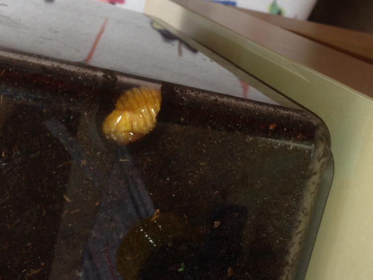 Mijn eerste pachnoda kever is eindelijk geen pop meer. Daarnet is zijn oranje velletje gescheurd en nu zijn de dekschilde mooi wit.