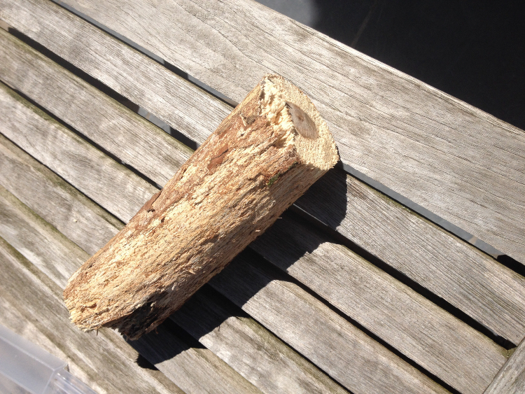 Je kunt zowel het stammetje als fijn gemaakt hout onderin de bak ingraven. Larven hebben de voorkeur voor een van beide maar als je ze beide aanbied zit je altijd goed.