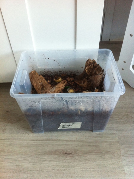 hoe dan ook, mijn box is ongeveer 30x40x40 schat ik. Heb er een laag substraat in zitten van 20/25 cm en bovenop wat stukjes hout. Voor alsnog lijken ze het goed te doen. Er vinden regelmatig paringen plaats en de vrouwtjes kruipen geregeld onder de grond. Ik ben heel benieuwd wat dit gaat worden