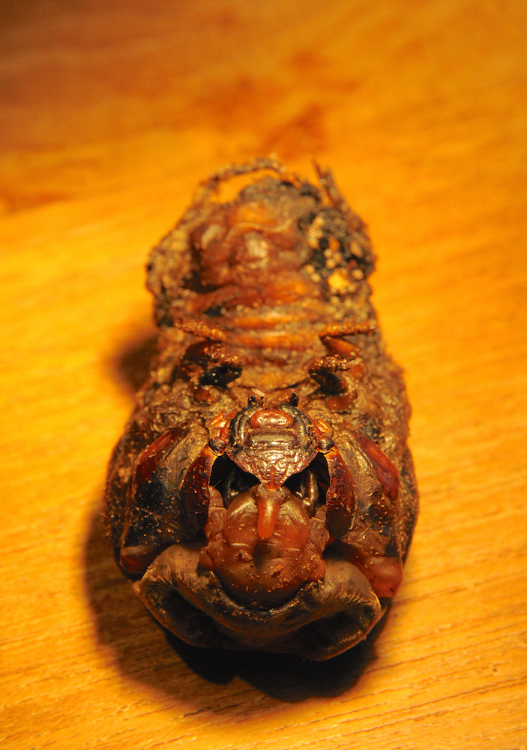 Ik had helaas geen flitser bij de hand en moest een gloeilampje gebruiken voor wat belichting. Vandaar de oranje kleur. De pop begon al snel steeds bruiner te worden en het werd er niet mooier op. Maar goed, voor een kijkje in de cocon bij de verpopping vond ik het wel leuk.