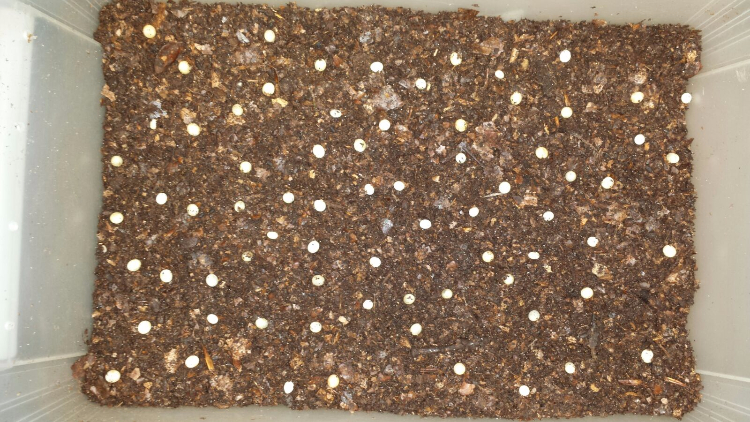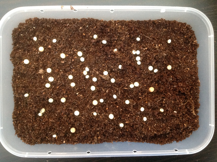 Een update: de eitjes zijn al aan het uitkomen en nu zijn er al 34 larven bij elkaar. Gaat heerlijk zo.