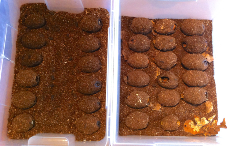 De eerste kevers moeten nog uitkomen, dus over de resultaten kan ik nog niet veel zeggen. Wat wel al erg opvallend is, is dat de eerste larve die is verpopt een van de "zomerlarven" was. Deze larve is afgelopen zomer (juli/augustus) uit het ei gekropen en zal komende week al uitkomen. Die heeft de cyclus dus doorlopen in ongeveer 10 maanden! Het resultaat is dat het misschien wel het kleinste exemplaar uit de serie is. Pas later begonnen de "winterlarven" te verpoppen. Deze zijn afkomstig van begin december 2014 en hebben dus minimaal 18 maanden over de cyclus gedaan. Dat is met 8 maanden extra bijna het dubbele!