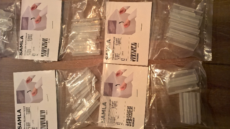 Vorige week ontdekt bij de Ikea... Sluitclips voor op de Samla bakken. Erg handig als je er imago's in hebt zitten die graag ontsnappen. De bakken blijven gewoon stapelbaar. Sterker nog ze kunnen nu nog minder makkelijk van elkaar af glijden. Zelf heb ik op de 11ltr bak genoeg aan 2 clips per bak. Er zitten 4 clips in een verpakking die zo'n €0,50 kosten. ;)