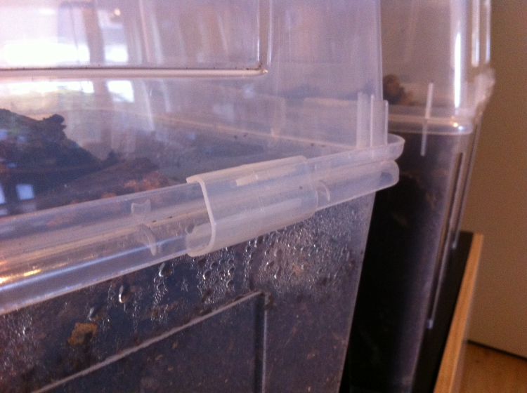 Wat ook handig is, en niet geheel zoals bedoeld, is dat je dezelfde klemmetjes kan gebruiken om twee bakken omgekeerd op elkaar te zetten. Voor bijvoorbeeld Mecynorhina soorten is het van belang dat ze voldoende diep substraat hebben om eitjes in af te zetten. Ik vul daarvoor een 20 liter bak tot de rand en zet er een 10 liter bak omgekeerd op. Dan heb je net een aantal centimeter extra bewegingsruimte voor de kevers en toch een mooi diep substraat. Werkt perfect!