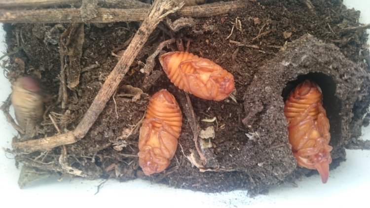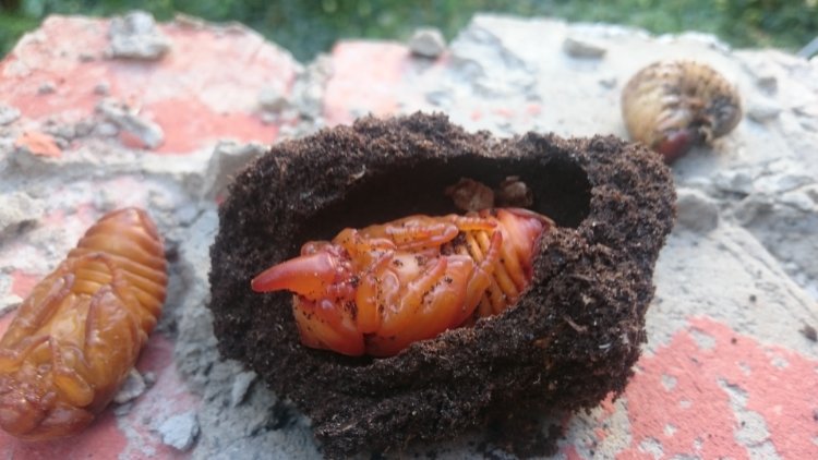 Het is heel droog in de composthoop en omdat ik een regenwaterput wou steken moest ik de hoop verplaatsen. Massa verpoppende kevers gevonden. Ik heb ze maar in 2 bakjes gedaan om zeker te zijn dat ze niet verder uitdrogen