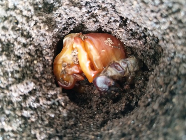 Deze Mecynorhina torquata ugandensis besloot om te gaan verpoppen in het substraat, zonder een cocon te maken.