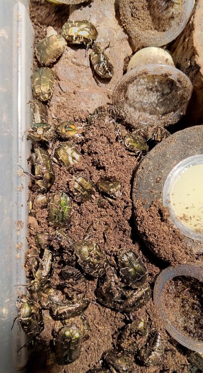 Ik heb nog een zwik Stephanorrhina guttata guttata, een stuk of 10 Dicronorrhina derbyana derbyana, een aantal Mecynorhina torquata ugandensis en een kweekgroep Protaetia cuprea obscura die actief zijn. Zal meenemen wat er tegen die tijd nog leeft.