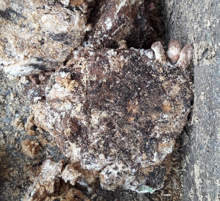Een berg met beukenzaagsel gebruikt voor de kweek van Shiitake.