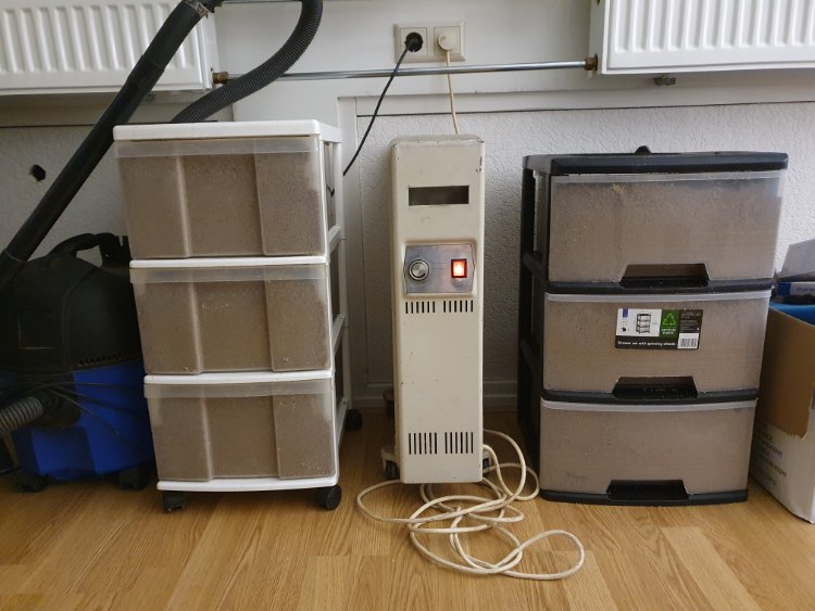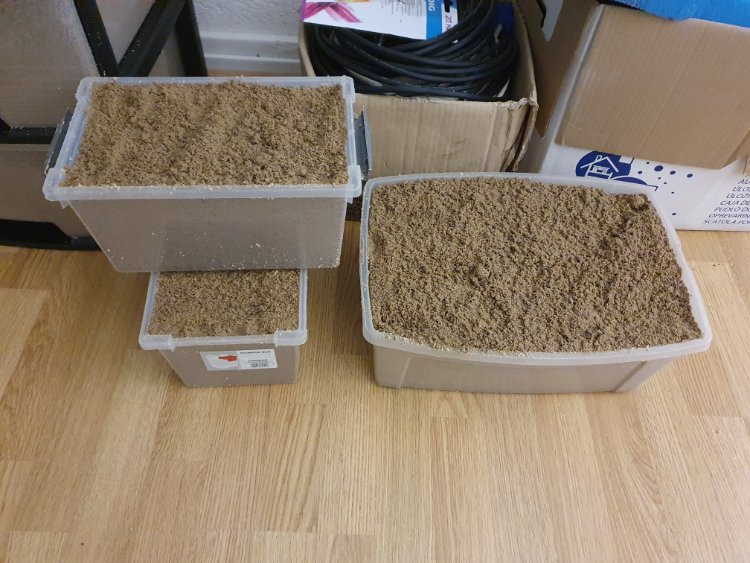 Dit woel ik om met de hand en een grotere bak, om vervolgens weer terug in de 30l bakken te gooien.