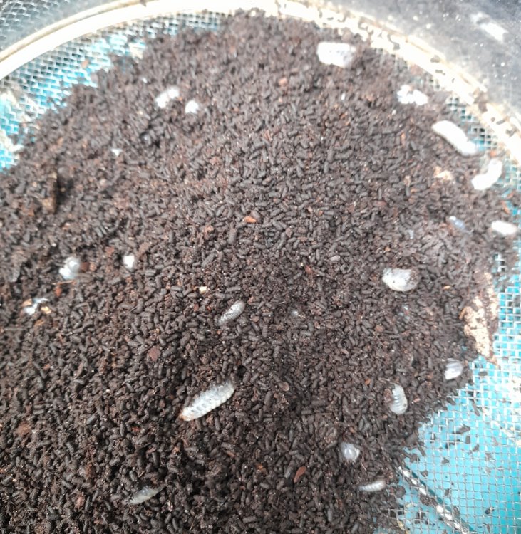 De poepjes schijnt het ei leggen aan te moedigen, het is eigenlijk heel simpel, kevers denken: o, hier zitten veel kevers dus dan is het goed hier, ga mijn eitjes ook maar hier leggen. Heb slechts een handje vol erdoor heen gemengd dus niet zo veel. Het werkt wel. Het is net goud zeven, maar dan naar eitjes zeven...