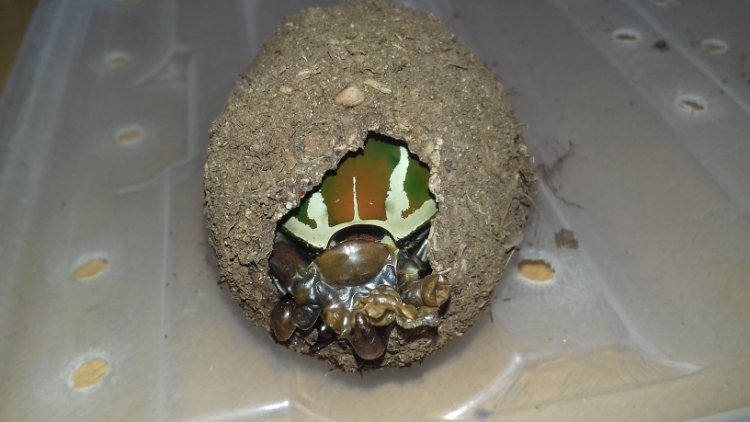 Jou toch even verwittigen; misschien is het interessant om na 3-4 dagen uit te harden in de cocon de voorkant (langs kopzijde van de kever) van de cocon open te maken; dit om de kophoorn volledig tot z'n letterlijke "recht" te laten komen. Anders riskeer je een kromme kophoorn en verlies je misschien 2-3 mm aan lengte.