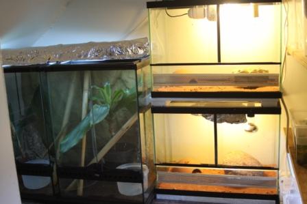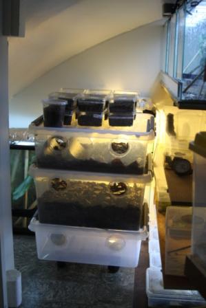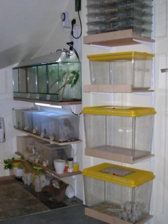Mijn cupboard under the stairs. Verwarmd tot een 25°c. s'zomers overdag wat warmer door de lampen. Kevers zitten enkel in de middelste bakken die op wieltjes staan. De rest zijn quarantaine en opkweekbakjes voor gekko's. Aan de deur hangen mijn krekelbakken. Ja, het staat zo vol als maar zijn kan.