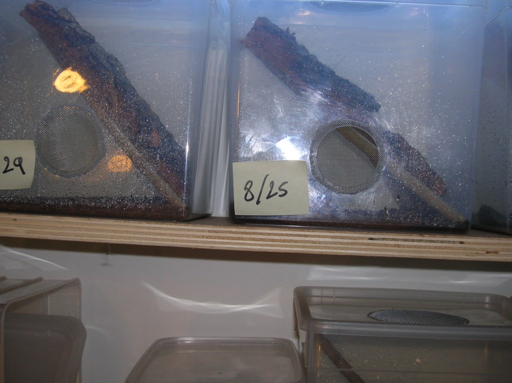 De gaten zijn gemaakt met een gatenboor. Wel een plank onder leggen want anders duw je de bak kapot. Daarna soldeer ik er met een soldeerijzer aluminium muggengaas op. Met je ene hand het gaas met je soldeerijzer in het plastiek drukken en tergelijkertijd met je andere hand het gaas dat je net ingesmolten hebt vasthouden terwijl het afkoelt. Vergt een beetje oefening maar eens je het tempo vast hebt dan loopt het vlot. Voordeel is dat je je gaten zo groot kan maken als je wil. En wanneer het gaas goed ingesmolten is oerdegelijk. Ook mijn gekko-opkweek Braplast dozen doe ik zo. Nog een voordeel is dat je je bakken kan sproeien door de verluchtingsgaten zonder de bak te moeten openen.