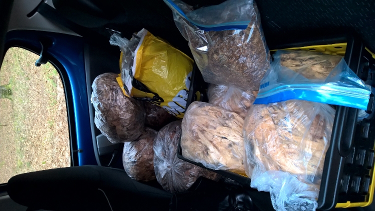 Wat ik op de vaste plekken doe (en die daarom ook niet te gedetailleerd doorgeef) is hout verzamelen wat nog (net) niet goed is. Verzamel plekken waar je de boel neer legt zodat je het de volgende keer makkelijk vind en kunt checken of het al goed is. Merendeels rot het niet op de gewenste manier of duurt enkele maanden tot jaren maar een paar goede stukken maakt dan al gauw weer een hoop goed. Vind je een goed stuk rothout en er zit een mooie witschimmel in, stop dan gerust een stukje bij een andere stuk hout in de hoop,dat de schimmel overstapt. Dat kun evt ook met blad doen als er weinig humus te vinden is. Gewoon een klein kuiltje graven, takken er omheen en erop zodat het niet zo snel wegwaait . Heb je een bos compost hoop.