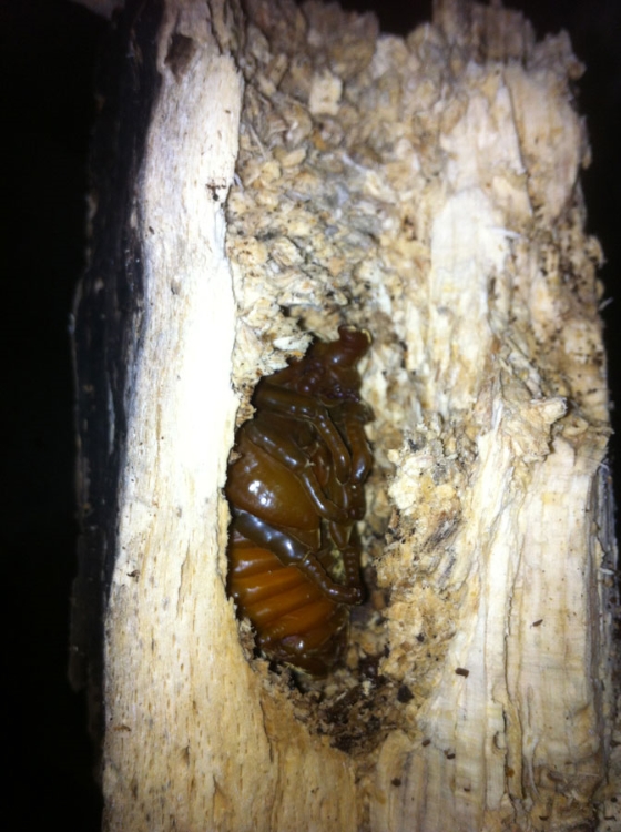 Ik had de larven in een grote curverbox met een heel groot stuk witrot hout erin. Hier deed ik ze in vlak voor ze gingen verpoppen zodat ze in deze stam hun cocons konden maken. Hieromheen was het opgevuld met hout/bladhummus mengsel. Een aantal weken tot misschien wel kleine maanden geleden kwamen de eerste vrouwtjes tevoorschijn, eerst 1 en een paar weken later twee andere. Nu liet het erg lang op zich wachten, ik begon mij af te vragen of het nog wel goed zou gaan en besloot toch maar de boomstam open te trekken. Tot mijn mega grote verbazing vond ik in het hout hele mooi gemaakte cocons, echt prachtig. Hierin echter vond ik de lijken van de kevers :o Prachtig mooie grote mannetjes en vrouwtjes. Sommige al overleden in popfase maar de meeste lagen daar gewoon als gestorven kever. Onbegrijpelijk wat hier fout gegaan zou kunnen zijn?! En het meest gekke van alles is nog; er was ook nog 1 levende pop aanwezig van een vrouwtje (helaas)