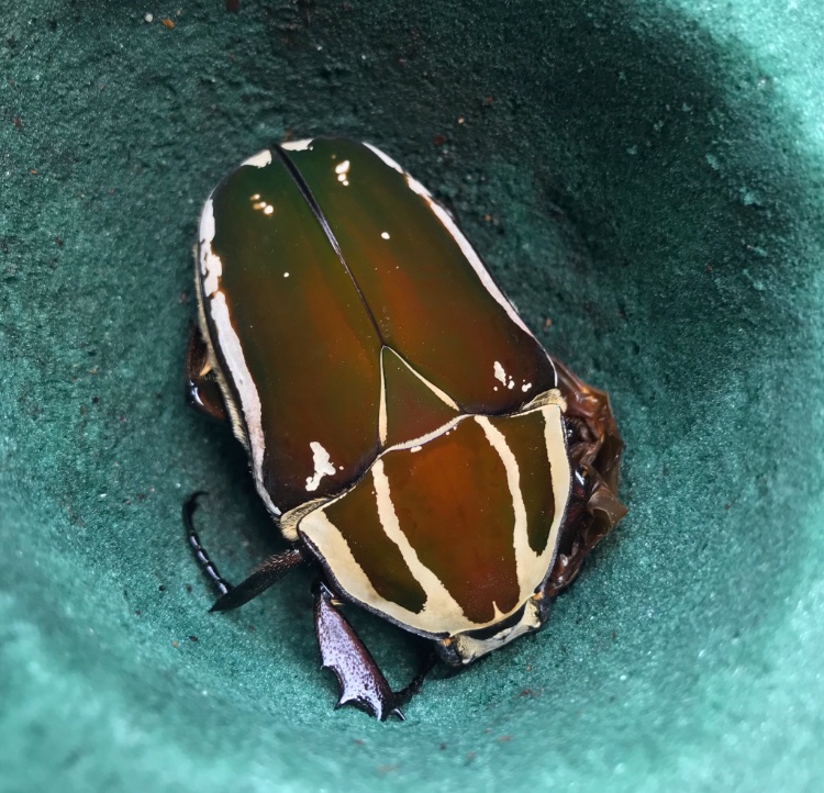 Ik kan haar nog niet helemaal goed bestuderen voorlopig, maar heb al gezien dat ze een beetje dat holografische rood/groen heeft wat je ook bij bijv. Stephanorrhina’s ziet, supermooi! Dit wordt er absoluut eentje die in de kweek gaat