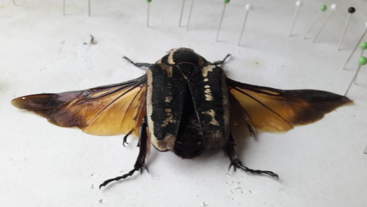 Ik weet niet precies wat je met glans bedoeld. Als je 'm netjes vast prikt en laat drogen kun je 'm nog jaren zo bewaren. Heb zelf nog nooit iets op m'n kevers gespoten. Kan mij ook niet voorstellen dat ze er dan mooier op worden.