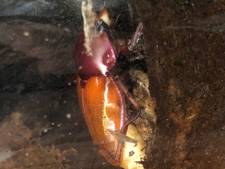 Ik houd nu al een tijdje de ontwikkeling van mijn eerste verpoppende P muelleri larf bij, en sinds vandaag lijkt ze opeens wel erg veel op een volwassen kever