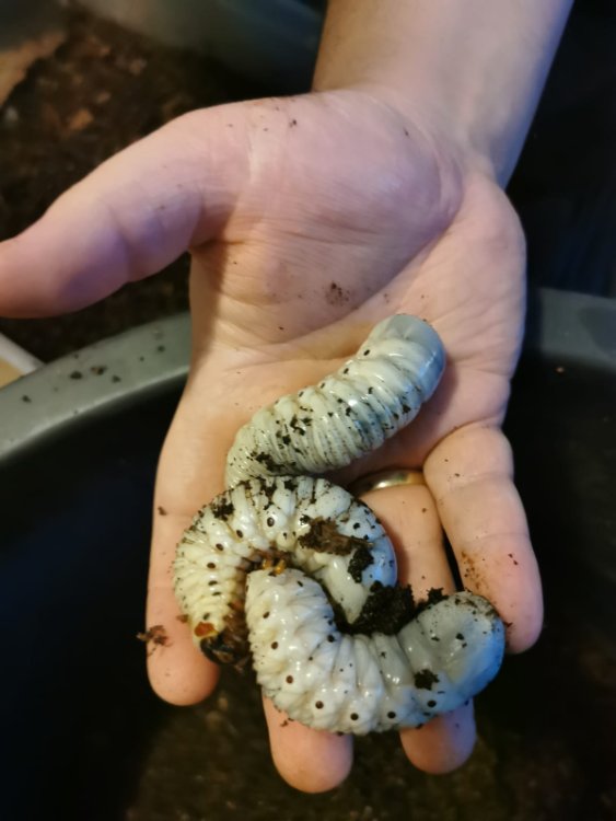 De larven zijn weer een beetje gegroeid: 26 - 31 gram. Ik vind het leuk dat de 30 gram grens doorbroken is. Het substraat was inmiddels aarde -achtig met redelijk veel poepjes; maar de poep heeft nog niet de overhand. Ik heb voor de zekerheid toch een groot deel van het substraat vervangen.