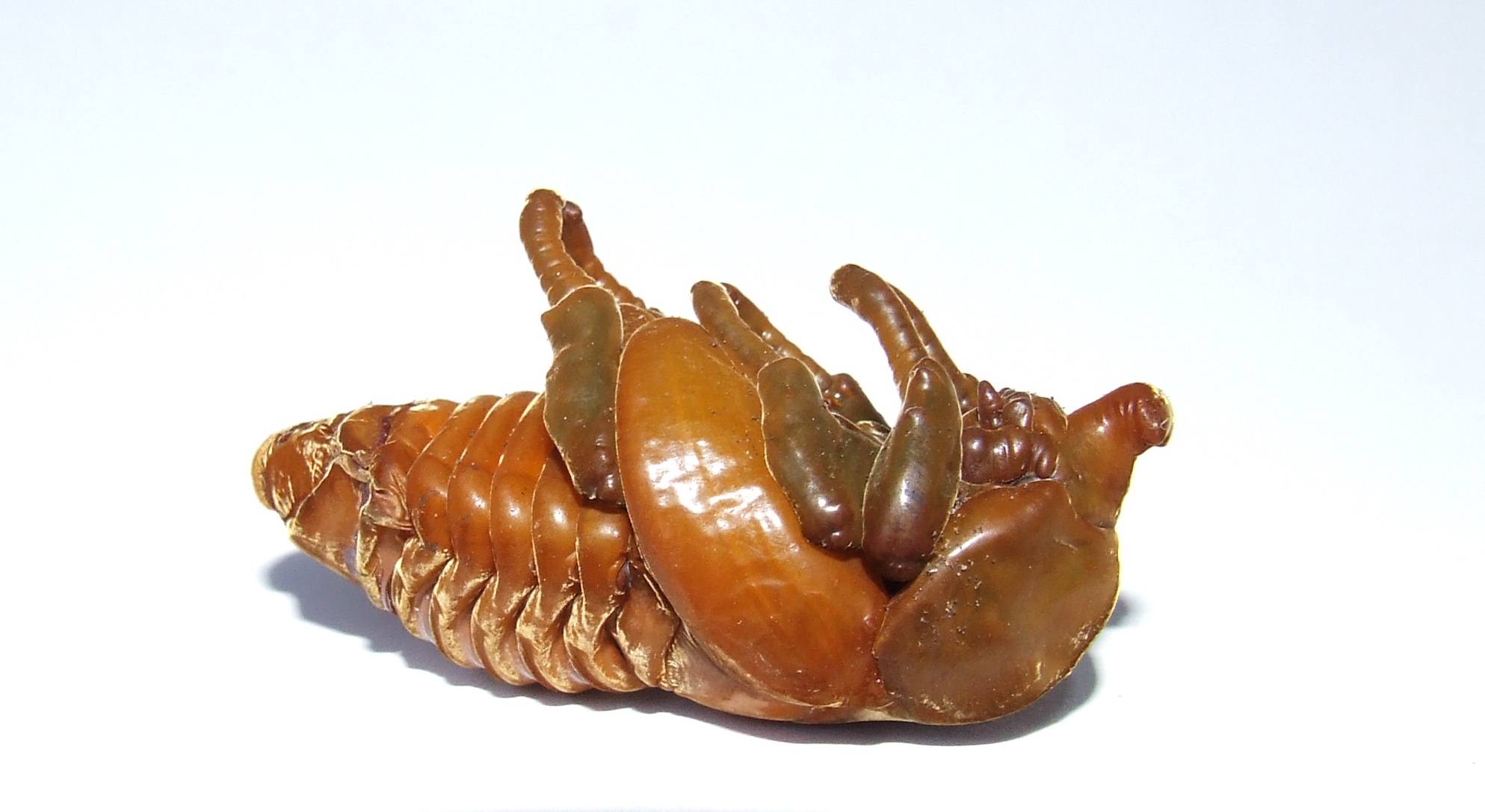 De vormen van de pootjes, vleugels, hoorns en dekschilden zijn al zichtbaar.