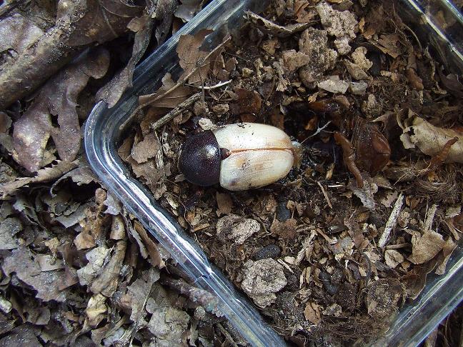 Dit is een net uitgekomen Xylotrupes gideon s... Na een paar uur kleurt ze wat bij en na een paar dagen is ze op de uiteindelijke donkere kleur.