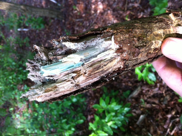 Laatst kwam ik tijdens het zoeken naar witrot hout een rotte eikentak tegen die niet alleen wit maar ook blauw was van binnen. En dan niet een beetje blauw, nee, smurfenblauw! Het is de eerste keer dat ik dat tegenkom en ik vroeg me af of of iemand me kan vertellen wat het is? Is het een schimmel? Is het een blauwalg? Ik ben erg benieuwd.