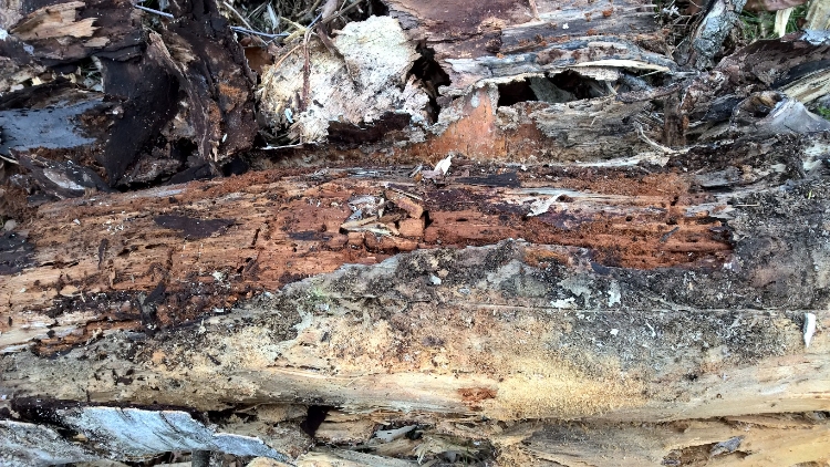Ook vond ik een stam rothout die heel duidelijk de verschillende soorten of stadia van rot in zich had.