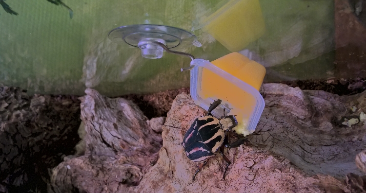 Gisteren bedacht ik mij ineens dat ik ze ook gewoon aan de glazen wand kan hangen. Zo is het eten in meerdere verdiepingen verdeeld, minder gedrang of ruzie en leuk voor het zicht. Gelukkig zijn de kevers het er ook allemaal mee eens en maken ze er druk gebruik van.