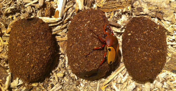 Gister is zowel de eerste M.t.ugandensis uitgekomen (mooie witte tekening op zwart pronotum) als de 56 gram zware man eindelijk verpopt. Ik heb de cocon opgegraven en bij de rest in de bak gelegd. Toen bleek al meteen dat het toch een flinke knaap gaat worden. De cocon is namelijk nog eens een cm groter dan die van de mannen die naar verwachting zo'n 70mm gaan worden. Ik gok dat 'ie tussen de 75 en 80mm uit zal komen. Ik ben in ieder geval benieuwd!