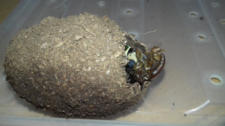 Jou toch even verwittigen; misschien is het interessant om na 3-4 dagen uit te harden in de cocon de voorkant (langs kopzijde van de kever) van de cocon open te maken; dit om de kophoorn volledig tot z'n letterlijke "recht" te laten komen. Anders riskeer je een kromme kophoorn en verlies je misschien 2-3 mm aan lengte.