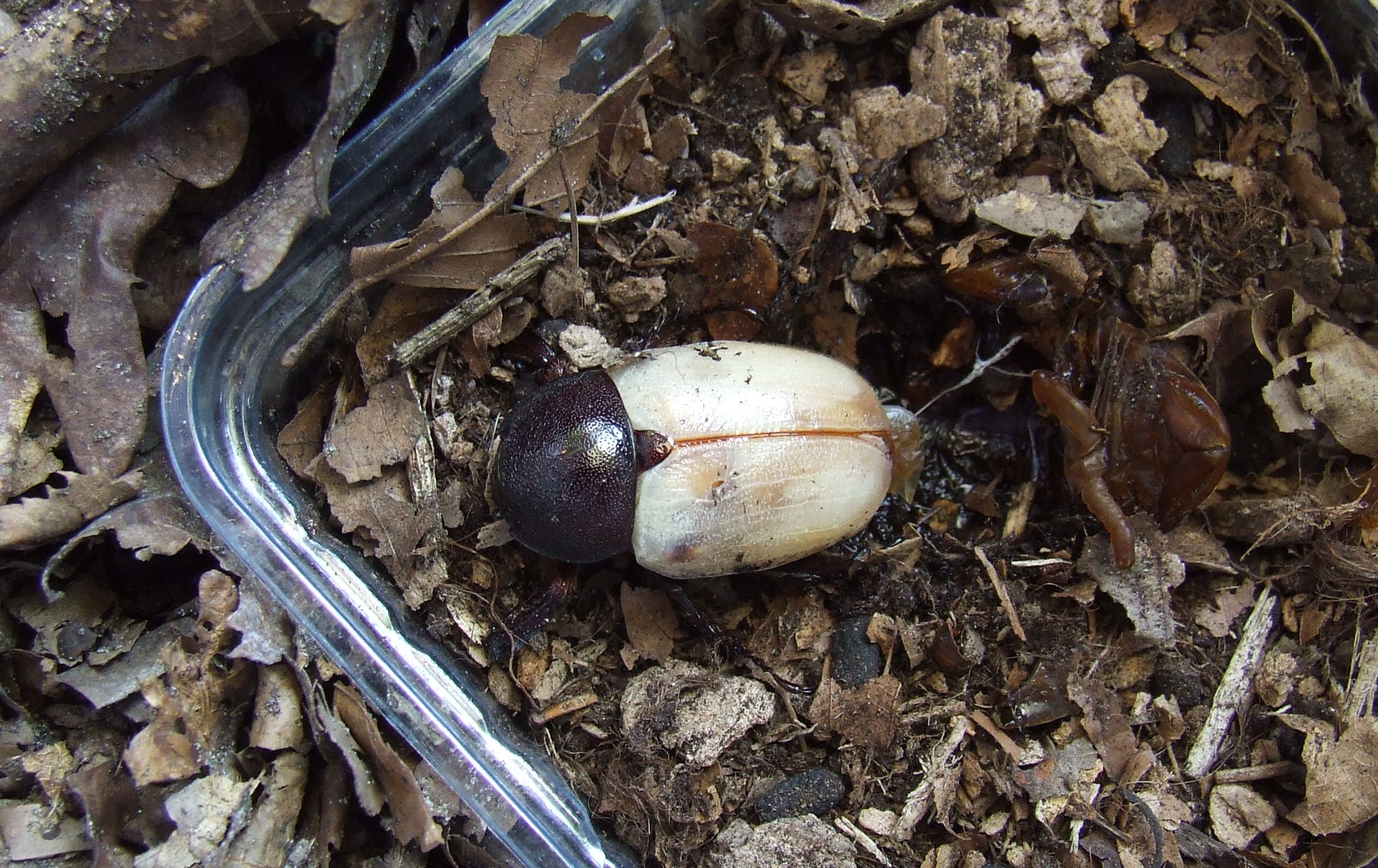 Als de kever na de verpopping uit de pop komt zijn zijn dekschilden nog zacht en wit. Hij moet dan nog enige dagen uitharden en op kleur komen.