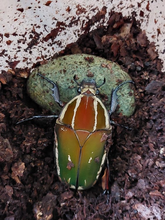 ik heb inmiddels zo'n 20 cocons liggen! De nieuwe generatie komt eraan! Ik heb een koppel larven + mijn 2 kleinste larven aan een vriend gegeven, en verder denk ik dat ik met 20 kevers echt wel makkelijk een generatie verder kom ;) Geen import nodig deze ronde. Ben benieuwd of er een klein beetje genetica te zien gaat zijn want ik heb de koppels toen op kleur samen gezet en sindsdien bijgehouden uit welke lijn de larven kwamen. IK verwacht het niet te zien, maar wie weet!