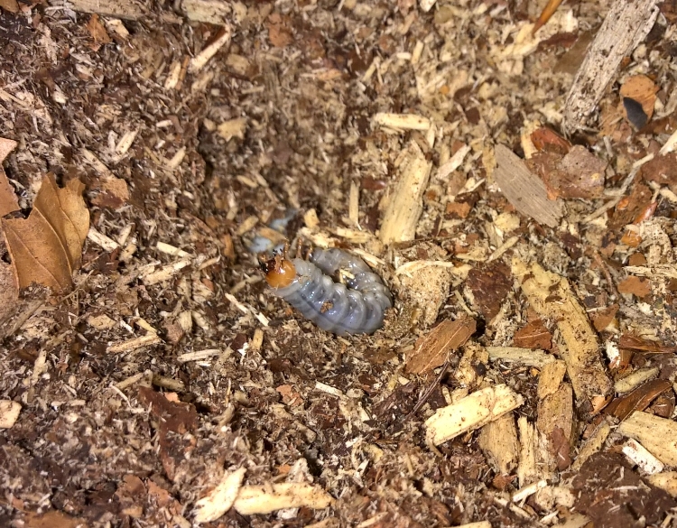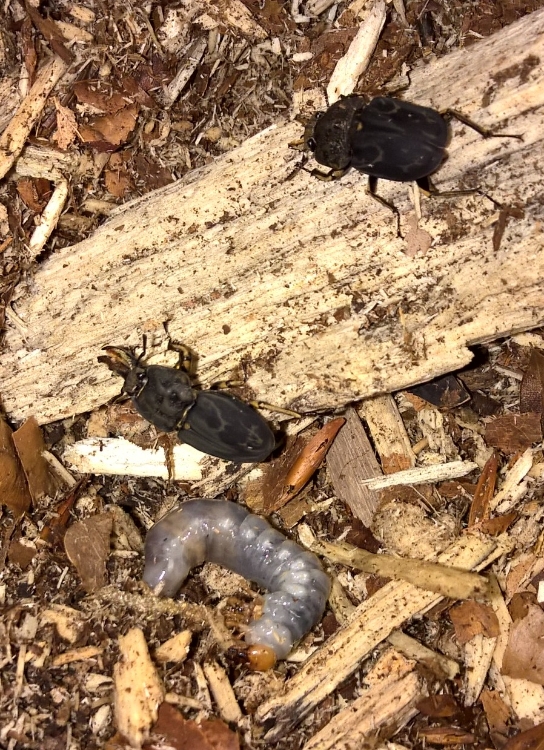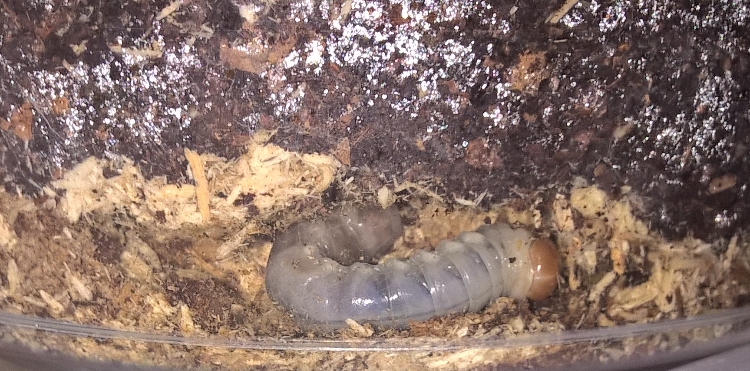 Zojuist een al hele dikke larf (2x de lengte van de imago) in het terrarium :D Ik heb er zo snel maar 1 gezien maar de bak is groot dus er zullen er ongetwijfeld meer in zitten. De imago's zijn in februari pas het terrarium in gegaan. Stond echt te kijken van het formaat dat de larf nu al heeft gezien hij pas vanaf februari als eitje gelegd kan zijn.