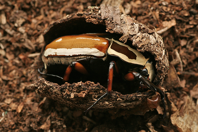 Helaas ook moeten constateren dat mijn Nigerse keverkweek mislukt is. Ik heb 6 cocons waarvan 1 zeker te weten een Nigerse kever wordt en nog 9 larven. Al het overige waren of Pachnoda's (ik heb vandaag een beetje een hekel aan die beesten) of zwarte poppen. Hoe dat komt weet ik niet, de Pachnoda's die onder dezelfde omstandigheden worden gekweekt doen het supergoed.