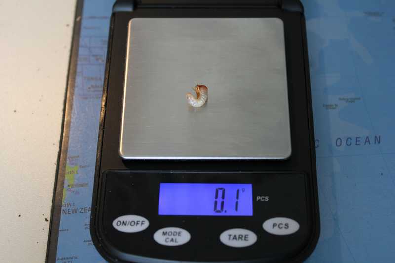 vandaag het larfje gewogen en verhuisd naar een iets groter bakje. het larfje weegt 0.1 gram en de kop heeft bijna de grote van een L3 pachnoda marginata peregrina kop 8-)