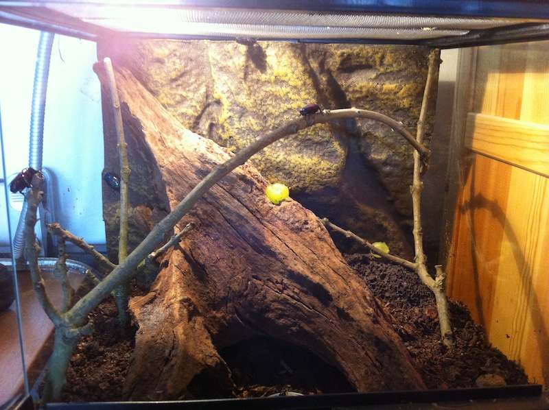 Ik heb nu alles bij elkaar in een terrarium gezet, wat ik zo ingericht heb dat je er van alle kanten naar kan kijken. Een dikke laag substraat op de bodem, flink wat klimmogelijkheden en de kevers gaan helemaal los! Dat is toch wel de kroon op het werk, na maanden enkel naar bakken te kijken.