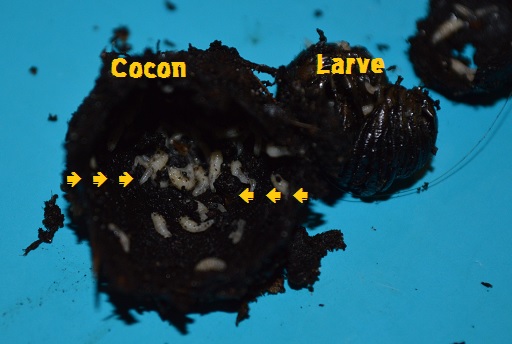 In deze enkele cocon hebben de vliegjes waarschijnlijk een gaatje kunnen vinden waarin ze de eieren hebben afgezet, dit was gelukkig ook de enige cocon waar ik de (verkeerde) larve in terugvond.