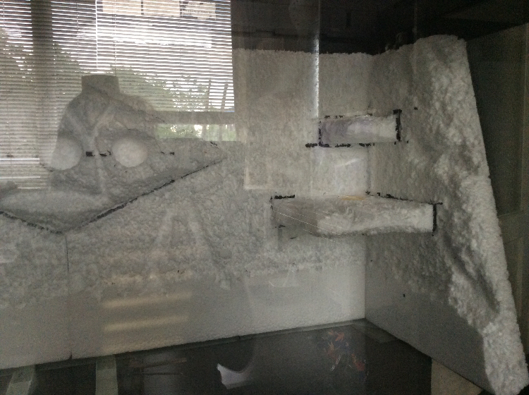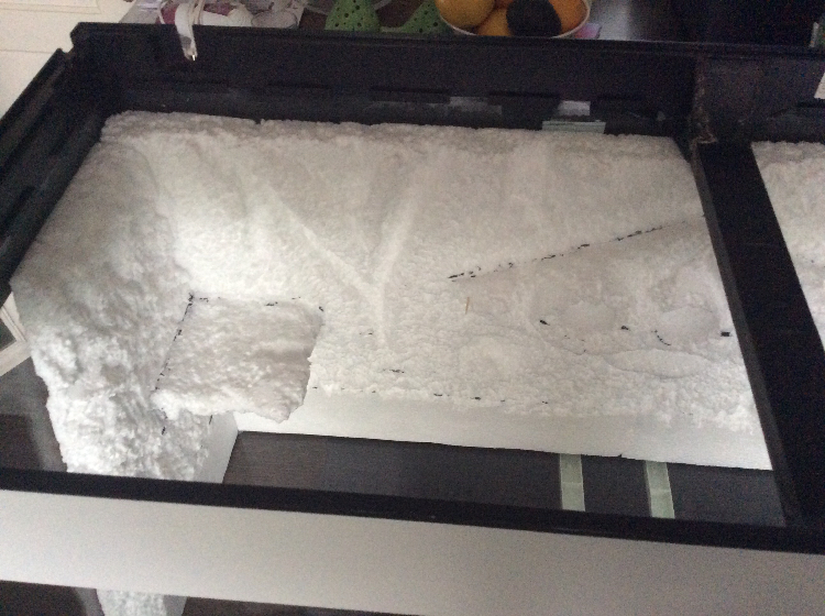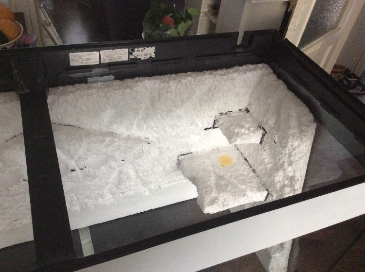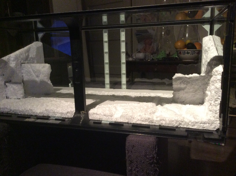 Dat van die parketlak met zand had ik al gelezen. Maar ik wil graag de hele achterwand donker spuiten met een plantenspuit gevuld met water en verf. Daarna wou ik de naar voren liggende delen lichter maken voor een mooi effect en op de plateautjes wou ik wat zand strooien voor extra grip. Op YouTube staan wel mooie filmpjes met mooie effecten.
