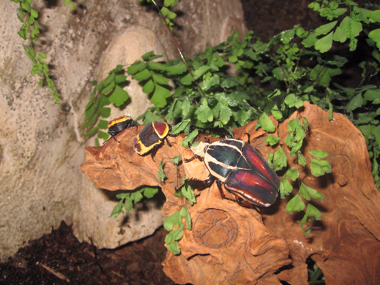 Op de achtergrond zie je mijn Pachnoda's druk aan het werk. Nu ik van de varkensluizen vanaf ben, dacht ik om het nog eens te wagen enkele planten in het terra te zetten. Deze maidenhair fern is alvast geen succes, de Pacnoda's vinden hem veel te lekker. Ze eten de bladen niet op maar kneuzen ze en drinken het plantensap, de rest verwelkt allemaal. Een andere varen laten ze met rust. Of ik nu de Pachnoda's moet gaan bestrijden of de varen gewoon laten opeten, weet ik nog niet :P