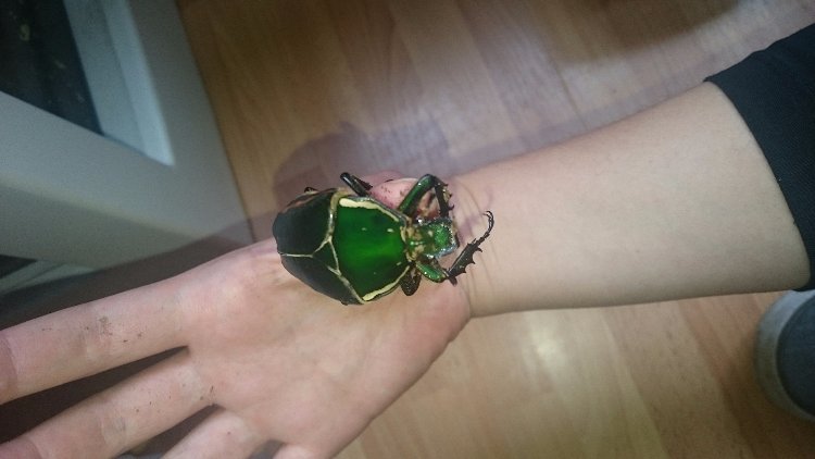 Vandaag is er weer een kever uit de cocon gekropen, maar ik twijfel of het een man of vrouw is.. Als larf heb ik (door de stip) gedacht dat het een man is.. Maar nu twijfel ik, de kever ziet er namelijk uit als vrouw, maar heeft wel een duidelijke groef aan de onderkant.. Betere foto's volgen later..