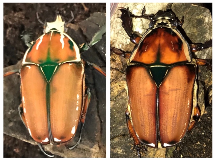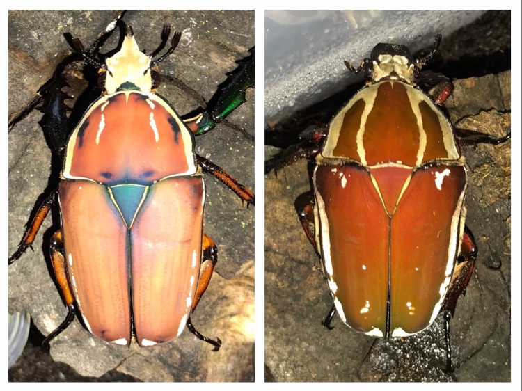 Ohh, wat jammer joh. Ik heb er 5, 4 mannen en 1 vrouw. De laatste man is niet goed uit de pop gekomen, zijn elytra harden niet goed uit en ik denk dat hij het niet gaat redden helaas. Maargoed, de overige doen het prima! Het paartje op de bovenste foto is even afwachten wat er aan flameshields overblijft, maar ik wilde toch ook graag wat vers bloed toevoegen. Ik laat je wel weten als er nakomelingen zijn!