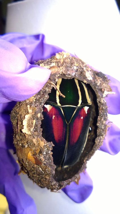 Pim heeft daar een heel mooi filmpje ergens van staan. Als ik mij niet vergis ging dit om een dame Mecynorhina Polyphemus. Daar zie je goed de kleur veranderen tijdens het uitharden van het schild.